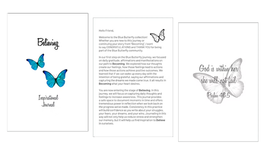 Blue Butterfly Collection was created to inspire and encourage young women through intentional journaling. The collection centers around a three-part series – Becoming, Believing, and Belonging – each designed to guide women through personal growth, confidence, and purpose.