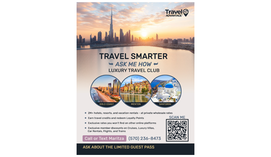 The flyer features key highlights of the luxury travel club and Maritza’s contact information.